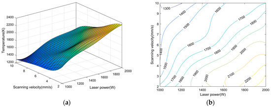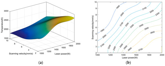 The temperature maximum of cladding layer with different process parameters: (a) 3D distribution, (b) contour plot.