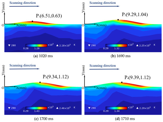 It can be observed from Figure 6 that the highest temperature of the cladding layer is 2.18 × 103 K at 1020 ms, the highest temperature of the cladding layer is 2.25 × 103 K at 1690 ms, the highest temperature of the cladding layer is 2.46 × 103 K at 1700 ms, and the highest temperature of the 1710 ms cladding layer after reaching a constant height is 2.29 × 103 K. This is because when the laser initially shoots into the cladding powder, the laser photon and the powder molecule collide and then produce an energy transfer after the powder absorbs light energy; that is, the kinetic energy of the photon is converted into molecular kinetic energy. Due to the interference of other factors such as reflection, there is a certain conversion efficiency that dictates that the kinetic energy of the photon cannot be fully converted and is quickly converted into molecular kinetic energy. The temperature of the cladding layer increases; after the height of the cladding layer reaches equilibrium, the macromorphology of the cladding layer changes from triangle-like to trapezoid-like, and the change in geometric size leads to the increase in powder molecules requiring energy conversion, so the temperature value decreases under the irradiation of the same heat source.