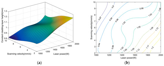 Constant cladding-layer height with different process parameters: (a) 3D distribution, (b) contour plot.
