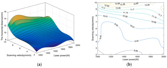 The horizontal distance from the starting point of constant cladding-layer height to the boundary of specimen with different process parameters: (a) 3D distribution, (b) contour plot.