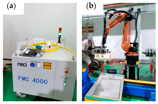 Laser-cladding-related equipment: (a) Reci FMC 4000 CW fiber laser, (b) KUKA six-degree-of-freedom robot system and processing table.