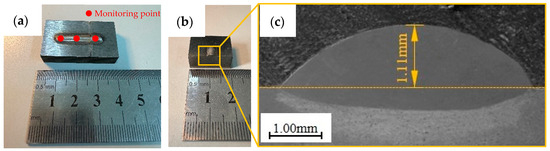 Macro and micro testing (1750 W/4 mm/s): (a) specimen and position of height measurement after processing, (b) macroscopic cross-section, (c) micrograph of the cross-section.