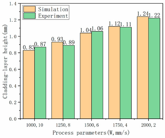 The cladding-layer height of the remaining four specimens was measured by the above method and compared with the simulation values, as shown in Figure 12. The difference between the experimental and simulation values under each group of process parameters shown in Figure 12 was calculated and divided by the corresponding experimental values, and the errors were 4.6%, 4.5%, 1.9%, 1.0%, and 1.6%, respectively.