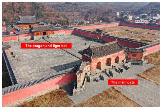 Yuzhen Palace, situated on Wudang Mountain, was established in the 10th year of the Yongle reign of the Ming dynasty (1412 AD). It is a significant heritage site within the ancient architectural complex of Wudang Mountain, recognized as a UNESCO World Heritage Site (as shown in Figure 1). The palace was constructed under the decree of Emperor Yongle, who sought to honor the Daoist master Zhang Sanfeng. Historical records indicate that the name Yuzhen Palace originated from Zhang Sanfeng, who built a thatched hut named “Yuzhen Palace” at the foot of Wudang Mountain during the late Yuan and early Ming dynasty. Emperor Yongle’s admiration for Zhang Sanfeng led to the construction of the palace, which was completed in the 15th year of the Yongle reign (1417 AD) and further expanded during the Jiajing period [1,2]. The Dragon and Tiger Hall, located at the main entrance to the inner palace complex, along with other structures like the main hall (Zhenwu Hall) and side halls, forms a complete architectural courtyard. The paintings on the Dragon and Tiger Hall are typical of the early Ming dynasty’s official style, known as “Xuanzi” paintings, characterized by their sophisticated craftsmanship and use of natural mineral pigments. In 2005, due to the impact of the South-to-North Water Diversion Project, the relocation of Yuzhen Palace was initiated. Over the course of 14 years, the site was elevated by 15 m, successfully preserving the original wooden components of structures such as the Dragon and Tiger Hall and the east and west side halls, and ensuring their placement in their original positions. Despite being entirely relocated, the original paintings on the wooden beams of the Dragon and Tiger Hall exhibit clear characteristics of early Ming dynasty style. These paintings are potentially the only surviving wooden painted structures from the Ming dynasty in the Wudang Mountain area, making them invaluable for historical, artistic, and research purposes.