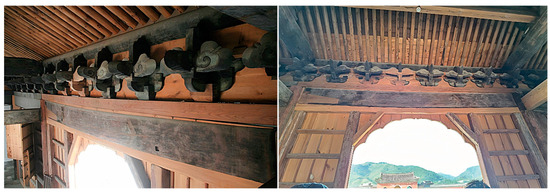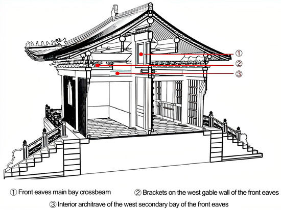 The Dragon and Tiger Hall is structured with a facade of three rooms and a depth of two rooms, featuring a single-eave hip-and-gable roof. The floor plan is organized with an inner and outer central hall layout. The main entrance has a solid wood door, and the east and west side rooms once housed statues of two deities, the Azure Dragon and the White Tiger, which are now missing. The rear eaves connect to the inner palace’s corridor buildings. The beam framework uses a five-purlin central pillar system with inner and outer double beams. Under the eaves, there are single-bracket-arm, three-stepped brackets. The double beams support pedestal brackets that carry the intervening brackets, which connect to the single beams supporting the main ridge purlin. The single and double beams insert into the central pillars, with the central pillars using complex joinery to support the ridge purlin. Overall, the structure is simple and clear. After relocation, the original painted components were restored to their original positions and appearances. Missing parts were replaced with new wood, left unpainted, making it easy to distinguish between the old and new components, as shown in Figure 2.