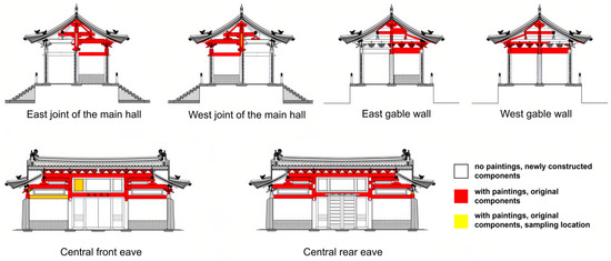 The location and distribution of the painted wooden components on the beams of the Dragon and Tiger Hall are shown in Figure 4. These painted components are primarily concentrated in the front-eaves area. During the relocation and reconstruction of the Dragon and Tiger Hall, these painted wooden components were not cleaned or restored but were instead reinstated directly in their original positions. Despite some paintings being darkened and the overall condition not being very good, the main elements of the paintings remain clearly distinguishable. The stylistic features are typical of early Ming dynasty official Xuanzi paintings. The composition is consistent with the decorative style of the Wudang Taihe Palace Golden Roof paintings, suggesting that they are original pieces from the construction of Yuzhen Palace during the Yongle period.