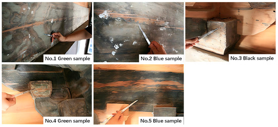 In the western side room and the main hall of the front eaves, samples of the original paintings were collected. Specifically, samples were taken from the inner beam and bracket set of the western side room and from the blue, green, black, and red areas of the walking board near the main entrance. Using a small knife, a minimal amount of sample was gently scraped from damaged areas to minimize damage to the artifacts. Efforts were made to collect relatively intact pieces to better observe the microstructural layers of the pigments and analyze the painting techniques. As shown in Figure 5, samples were collected from two locations on the inner beam of the western side room’s front eaves, three locations on the brackets of the western mountain side of the front eaves, and two locations on the walking board near the main entrance, resulting in a total of seven samples with color remnants from three different locations.