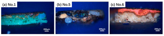 The cross-sectional microscopic images of the painted samples are shown in Figure 8. The cross-sectional microscopic analysis revealed that sample no. 1 consists of a bottom layer of green pigment directly applied to the wooden component with no ground layer, covered by an upper layer of dust and contaminants. Sample no. 5 shows a bottom thin ground layer, a middle layer of blue pigment, and an upper layer of dust and contaminants. Sample no. 7 is composed of a bottom ground layer, followed by a yellow-brown layer (likely an initial oil undercoat), a red pigment layer, and an upper layer of contaminants.
