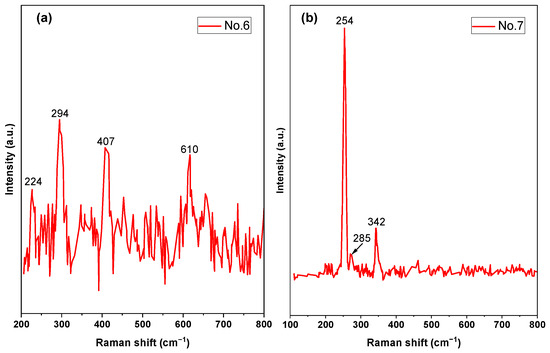 The Raman spectra for samples no. 6 and no. 7 are shown in Figure 10. Pigment no. 6 showed significant peaks at 224 cm−1, 294 cm−1, 407 cm−1, and 610 cm−1 (Figure 10a). These peaks suggest the presence of hematite (Fe2O3), which is commonly used as a red pigment in ancient art. The Raman spectrum for the pigment no. 7 from ancient paintings exhibited significant peaks at 254 cm−1, 285 cm−1, and 342 cm−1, as shown in Figure 10b. These peaks suggest the presence of vermilion (HgS), a common red pigment used in ancient artworks [28]. The peak at 254 cm−1 corresponds to the stretching vibrations of the Hg-S bond, which is a distinctive feature of cinnabar. The additional peaks at 285 cm−1 and 342 cm−1 are also indicative of the vibrational modes associated with mercury sulfide. Cinnabar was favored in ancient times for its vibrant red color and stability [29].