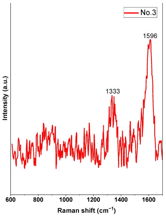 The Raman spectra for sample no. 3 are shown in Figure 11. The Raman spectrum for the black pigment no. 3 from ancient paintings reveal significant peaks at 1333 cm−1 and 1596 cm−1. These peaks are characteristic of carbon-based materials, specifically indicating the presence of amorphous carbon or carbon black. The broad peak at 1333 cm−1, known as the D-band, is attributed to disordered graphite or defects within the carbon structure, while the peak at 1596 cm−1, known as the G-band, corresponds to the in-plane vibrational modes of sp2-bonded carbon atoms in graphitic materials. The overall trend shows a high intensity around these peaks, suggesting a significant amount of carbon content in the pigment. The use of carbon-based pigments, such as carbon black, was common in ancient artworks for producing black colors due to their stability and strong absorption properties. The Raman peak wavenumbers of all samples and their corresponding pigment types are shown in Table 1.