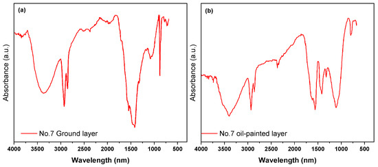 Infrared spectra of no. 7 ground layer and oil-painted layer: (a) no. 7 ground layer; (b) no. 7 oil-painted layer.