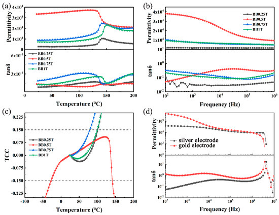 (a) Dielectric temperature spectra (at 1 kHz), (b) frequency spectra (at room temperature), (c) temperature coefficient of capacitance (TCC) of BB100xT ceramic samples with Ag electrodes, and (d) comparison of dielectric frequency spectra with different electrodes.