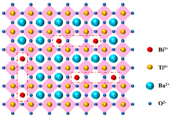 Since the ionic radius and electronegativity of Bi and Ba are almost similar, the doped Bi3+ ion (1.45 A) in BaTiO3 usually replaces the A-site Ba2+ (1.61 A). Due to the difference in ion valence, every two Bi3+ ions that replace Ba2+ ions will create an A vacancy (shown in Figure 4), which will result in compositional fluctuations on a microscopic scale, and then, the sample heterogeneity is enhanced. Therefore, the dielectric peak dispersion of BB0.5T ceramics can be attributed to the compositional fluctuation and substitution disorder of cations in the lattice, resulting in microscopic inhomogeneity in the perovskite structure, namely a superimposed effect of Curie peaks. The relevant defect equation can be expressed according to the Kröger–Vink symbol as follows.