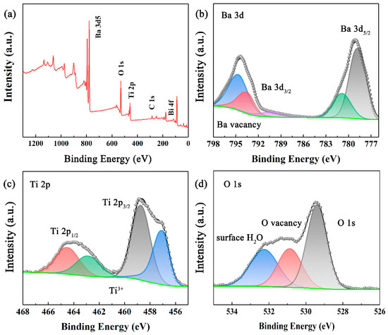 Ion substitution leads to the formation of point defects, which are closely related to the microstructure and dielectric properties of perovskite ceramics. Therefore, the XPS of BB0.5T ceramic samples was used to further prove the above deduction. Figure 6a shows the total spectrum of the ceramic sample, verifying the existence of Ba, Ti, O, and Bi characteristic peaks. The Ba 3d5/2 and Ba 3d3/2 peaks are located at 778.8 eV and 793.8 eV, respectively, while the peaks at a higher binding energy of 780.9 eV and 794.8 eV are characteristic of Ba vacancies [28], proving the substitution of Bi3+ at the A site, as shown in Figure 6b. The O 1s peak is divided into three small peaks, attributed to Ti-O bonds, oxygen vacancies, and surface water [29], where oxygen vacancies are inevitably produced by the evaporation of Bi2O3 in the ceramic. The peaks at 458.8 eV and 464.6 eV correspond to Ti 2p3/2 and Ti 2p1/2, respectively, while the peaks at 457.1 eV and 463 eV prove the existence of Ti3+ [30]. This is because the substitution of Bi3+ at the Ba2+ site causes an imbalance in charge, producing not only Ba vacancies but also mobile electrons, by the charge compensation mechanism. Thus, the electrons will reduce Ti4+ to Ti3+ (shown in Figure 6c,d).