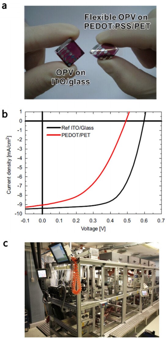 (a) Comparison between OSCs fabricated on rigid ITO/glass and flexible PEDOT:PSS/PET substrate. (b) Current density–voltage (J-V) characteristics of OSCs fabricated on rigid ITO/glass and flexible PEDOT:PSS/PET substrate. Reprinted with permission from ref. [39] (copyright Elsevier 2011). (c) Picture of pilot R2R printing machine [38]. Reprinted with permission from ref. [38] (copyright John Wiley and Sons 2019).