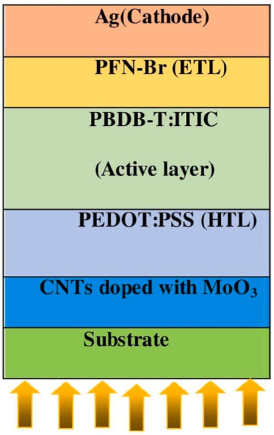 Bharti Sharma et al. employed the SCAPS 1-D software (3.3.09) to simulate the performance of NFA-BHJ-OSCs utilizing a transparent electrode composed of carbon CNTs doped with molybdenum trioxide (MoO3) (see Figure 4) [23]. The results indicated significant enhancements in various photovoltaic parameters for OSCs utilizing CNTs as contacts compared to those based on ITO electrodes. This improvement was also reflected in the external quantum efficiency (EQE) spectra, with CNTs exhibiting a larger EQE value over a wider wavelength range. Optimized PCE of 22.71% was achieved with an FF of 63.14%, short-circuit current density (JSC) of 38.38 mA/cm2, and open-circuit voltage (VOC) of 0.9371 V by varying the band gap of MoO3-doped carbon nanotubes. Moreover, by employing alternative hole transport layers (HTLs) such as CuI, Cu2O, and CuSCN, superior device performance was attained. Notably, the highest PCE of 27.57% was achieved with an FF of 70.88%, JSC of 37.12 mA/cm2, and VOC of 1.048 V in the CuSCN case, demonstrating significant potential as a transparent conductive electrode (TCE) for enhancing the device performance of OSCs in the future.