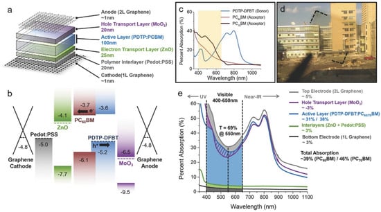 - Song, Y.; Chang, S.; Gradecak, S.; Kong, J. Visibly-Transparent Organic Solar Cells on Flexible Substrates with All-Graphene Electrodes. Adv. Energy Mater. 2016, 6, 1600847. [Google Scholar] [CrossRef]