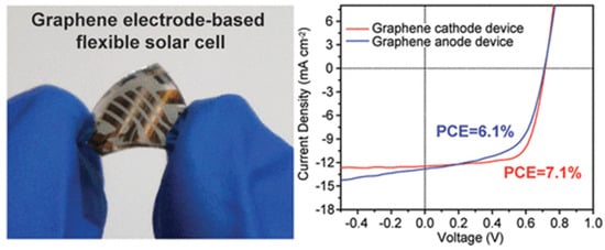 Graphene electrode-based flexible solar cell and power conversion efficiencies of graphene anode- and cathode-based flexible PSCs. Reprinted with permission from ref. [52] (copyright American Chemical Society 2014).