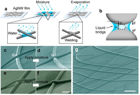 The electrical properties of AgNW films are significantly impacted by the resistance at wire–wire junctions within the films. Currently, the main method to reduce this resistance involves nano-welding or soldering techniques. However, these methods have drawbacks, including the need for specialized equipment, additional materials like “solders”, and potential adverse effects on the AgNW films and substrates. Yuan Liu et al. introduced capillary force to cold weld AgNWs, enhancing junction contact [59]. They employed a moisture-treatment approach to induce capillarity, thereby improving the performance of AgNW networks. The experimental process of moisture treatment involved two steps: moisture application and drying (refer to Figure 7). Moisture was applied to the AgNW film electrode using a humidifier or simply by breathing on it for 1–3 s. Subsequently, the sample was allowed to air dry naturally for 30 to 40 s, aided by gentle fanning to facilitate the drying process. Without any further treatment, they successfully reduced the sheet resistance and enhanced the mechanical flexibility of the AgNW films, while observing no noticeable changes in optical transmittance.