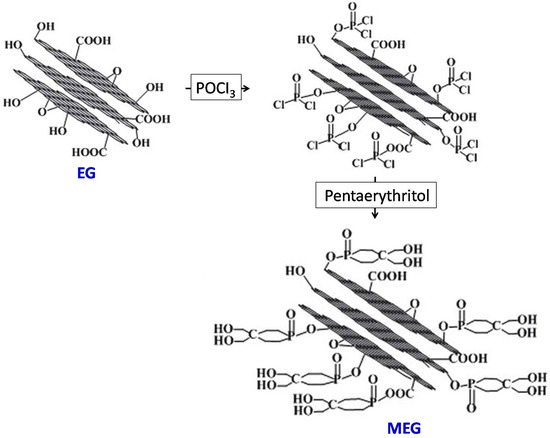 A solution of EG (20 g), POCl3 (6 mL), and 1,4-dioxane (500 mL) was placed into a reactor and heated to 60 °C for a period of 3 h. Subsequently, 9 g of PER was added to the reactor and heated to 100 °C for a further 6 h, resulting in the crude product. The resulting crude product was filtered, washed with 1,4-dioxane, and subsequently dried under a lower pressure at 80 °C for 12 h, thereby obtaining MEG, as shown in Figure 1.