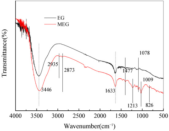 The production process of MEG is divided into two steps. First, POCl3 is grafted onto the EG surface. Then, P-Cl is esterified with PER. The Fourier infrared spectrometer in the experiment was Labsys Evo STA, produced by Setharam Instruments in France. The spectral resolution was 0.25 cm−1 and was determined at a high speed of 20 spectra/s. Figure 2 shows the FTIR spectra of EG and MEG. In the spectrum of EG, a solid peak appears at 3452 cm−1, which is due to the stretching vibration of the -OH and C-O groups. This stretching vibration indicates the presence of -OH in EG and its ability to react with POCl3. There are also many new absorption peaks in the MEG spectra. The peaks at 2935 cm−1 and 2873 cm−1 are carbon–hydrogen bonds, while the peak at 1213 cm−1 is P = O. The peak at 1078 cm−1 indicates cyclic P-O bonds, while the peaks at 1009 cm−1 and 826 cm−1 indicate P-O-C bonds. The infrared spectra of EG and MEG show that an organic–inorganic hybrid intumescent flame retardant was successfully synthesized by modifying MEG with a carbonylating agent.