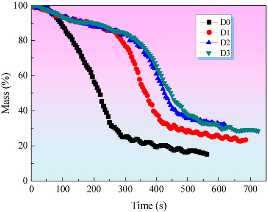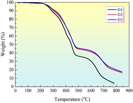 Figure 4 illustrates the weight of the char residues for all samples. It can be observed that the char residue weight of sample D2, which contains both EG and IFR, is greater than that of sample D1, which contains only IFR, throughout the entire burning period. This suggests that EG can enhance the weight of the char residue by increasing its expansion degree, which in turn improves its heat shield performance. Therefore, the char residue weight of D2 is greater than that of D1. The addition of MEG to the fire-retardant coating (sample D3) resulted in an improvement in the char residue. The char residue of sample D3, consisting of IFR and MEG, is the highest among all samples before 550 s. At this point, the percentage of char residue in sample D3 is in excess of 40 wt%. This evidence suggests that MEG can enhance the formation of char residue in this coating system. This can be explained by the fact that compact char residues form on the surface of coatings with IFR and MEG during combustion, acting as a physical protective layer. The char residue acts as a protective barrier, limiting the diffusion of oxygen to the substrate or decreasing the rate of volatilization of combustible gasses, particularly aromatic gasses which are precursors of smoke [8,10]. When the test time exceeds 550 s, the char residue weight of D3 is observed to be lower than that of D2. This phenomenon can be attributed to the formation of amorphous carbon on the surface of the D3 sample, which can undergo oxidation under conditions of high-heat radiation, resulting in a reduction in the char residue weight of the D3 sample.