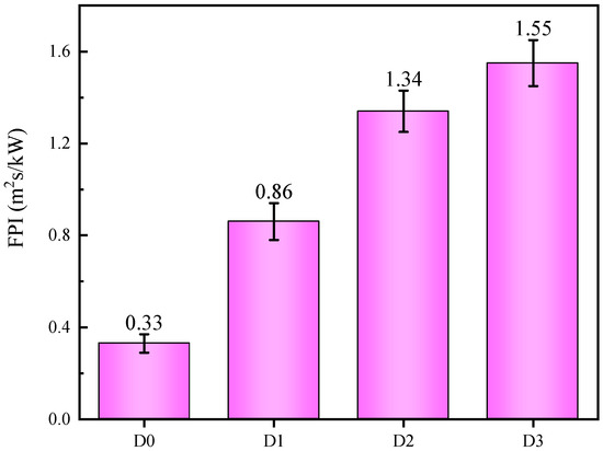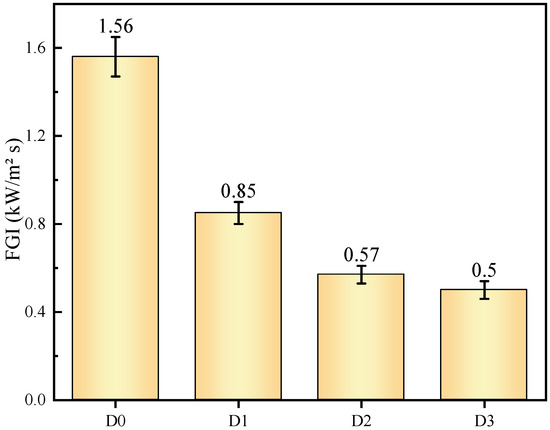 Following the cone calorimeter test, the fire performance index (FPI) and fire growth index (FGI) are calculated to evaluate the fire hazard. The FPI (m2 s/kW) is the ratio of the time to ignition (TTI) to the PHRR, and the FGI (kW/m2 s) is defined as the ratio of the peak HRR to the time to PHRR (TTP) [10]. The FPI and FGI are calculated directly from the cone calorimeter test data and thus provide a direct reflection of the safety ranking of the samples. It is reasonable to assume that materials with a higher safety rank should require high FPI and low FGI values. The FPI and FGI results are shown in Figure 6 and Figure 7, respectively [2,7]. Sample D3 treated with IFR/MEG has the highest FPI value and the lowest FGI value, indicating that it has a relatively high fire safety rank.