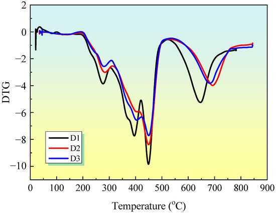Figure 11 shows the derivative thermogravimetric (DTG) curves for IFR coatings. The thermal degradation of IFR coatings occurs in four distinct stages. The temperatures of the maximum mass loss rate (Tmax) of sample D1 with IFR and sample D2 with IFR/EG are observed to be lower than that of sample D3 with IFR/MEG throughout the degradation process. Furthermore, the addition of MEG is observed to accelerate the initial stage of thermal degradation. Melamine and APP degrade between 300 and 500 °C, releasing N2 and NH3. PER and MEL also decompose in this temperature range. [19]. When MEG was added to these coatings, the thermal stability of the second and third degradation stages was significantly enhanced. The amorphous carbon formed in the previous stages is decomposed, so that a fourth degradation stage occurs between 500 and 800 °C. The presented evidence lends support to the proposition that MEG enhances the thermal stability of these intumescent fire-retardant coatings.