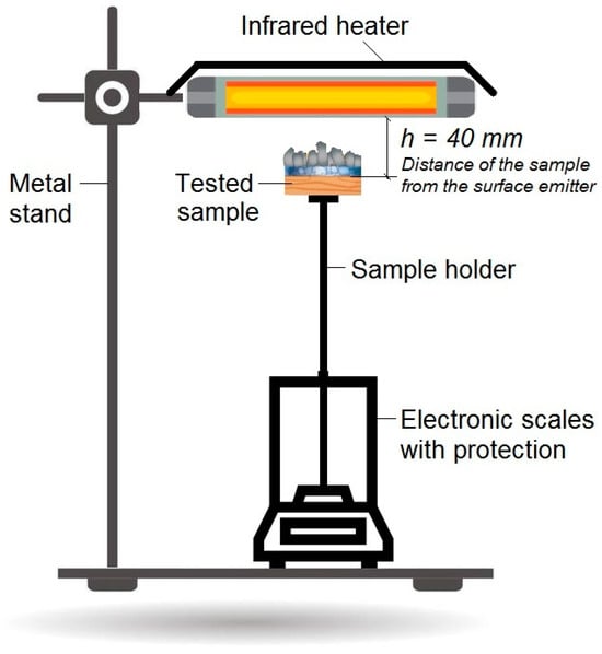 Non-standard test method—radiant heat source test was chosen to evaluate fire-retardant properties of examined EG-treated wood samples. In this method, a ceramic horizontal thermal infrared heater (Ceramicx, Cork, Ireland) with a constant electric power of 1000 W and Radwag PS 3500.R2 electronic scales (Radom, Poland) were used. The heat flux on the sample surface was 30 kW/m2. The duration of action was 600 s, and the distance of the samples from the surface of the heater was 40 mm []. The schematic of the arrangement of the experimental equipment is shown in Figure 1. The mass loss was recorded every 10 s (using the RLAB program). Any ignition of the samples was visually checked with a time record from the start of the test using a stopwatch if this phenomenon occurred. Subsequently, the relative mass loss and relative burning rate of wood from the measured values were calculated according to the following Equations (1) and (2) []: