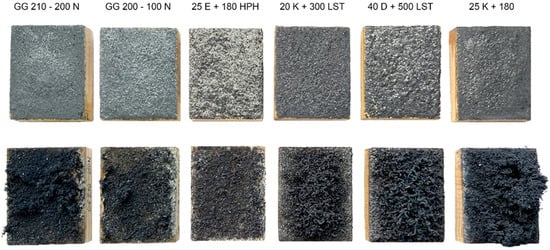 In terms of evaluating the adhesion of the carbon layer after graphite expansion, on the other hand, samples with graphite 40 D + 500 LST with the highest expansion volume (400 mL/g) and the largest particle size of 500 μm stood the best, and the expanded layer was only minimally dusted spontaneously from the surface. Similarly, samples with a graphite content of 25 K + 180 had the second-highest expansion volume (250 mL/g) from the tested series of graphites. However, we cannot talk about the connection between the layer adhesion and the expansion volume of thermographite because, for example, the sample with 25 E + 180 HPH with the same expansion volume of 250 mL/g, as mentioned above, showed the lowest layer adhesion after expansion. Most were dusted from the surface of the sample. Insufficient adhesion (i.e., mass loss of the expanded layer more than 20%) was also noted in samples with GG 200–100 N. Conversely, the second type of US graphite GG 210–200 N with the lowest expansion volume of 80 mL/g had relatively good adhesion. Improving the compactness of the layer after expansion could be done in the future by additional coating treatment with the surfactant solution itself or by surface color treatment. However, the adhesion of the expanded coating layer with the wood surface was evaluated as sufficient in all formulations, regardless of the type of EG used.