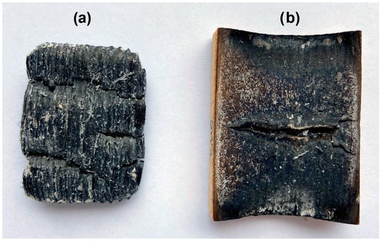 For applying the surfactant formulation with EG, the method of painting the mixture with a brush with synthetic fibers was chosen. The mixture was relatively easy to spread, but achieving an even coating was more difficult and required a certain skill. Another possible method of applying the mixture is with a metal spatula, thanks to which a fairly even layer of graphite can be achieved on the surface of the wood. A total of 60 samples coated with selected formulations were prepared for the test with a radiant heat source, i.e., 10 samples from each series differing in the type of EG in the formulation. Furthermore, test samples of wood were painted with only surfactant (CNC) to determine the thermal resistance of the surfactant itself. Ten samples of spruce wood remained untreated, creating the so-called reference series. The amount of formulation applied to a given area of the sample, i.e., 40 × 50 mm2, was 1.00 ± 0.05 g. The control was carried out by weighing the sample on analytical balances, and emphasis was placed on the uniformity of the coating. All coatings prepared in this way had a thickness of 442–495 μm, as subsequently determined by image analysis obtained using a Nikon Eclipse Ni polarizing microscope at 40× magnification and 0.85 μm/px resolution.
