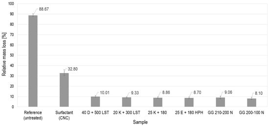 Relative mass loss of examined samples—reference (untreated), CNC-treated, and EG-treated spruce wood.