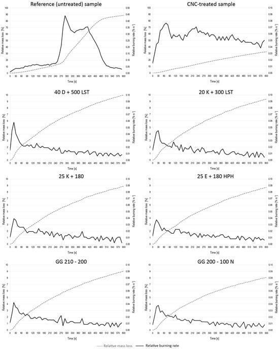 For the sample treated only with CNC surfactant, there is a linear decrease in this quantity over time compared to all other tested samples. It is interesting that the linear section of the weight decrease in the time 0–270 s is almost identical to the course of weight loss in the untreated reference sample. In both cases, there is a weight loss of approximately 15.5%–15.7% in the given time, while for samples treated with formulations with EG, this loss is more than half lower, i.e., 6.4%. In the case of the untreated sample, the highest total weight loss (68.6%) occurs in the time range of 270–500 s during which the sample burns. In the last 100 s of the measurement, the weight loss of the untreated sample is negligible, which indicates the termination of its burning.