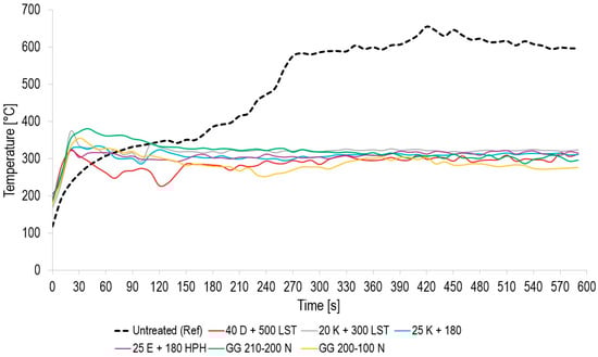 The graph in Figure 6 shows the temperature evolution on the exposed surface of the examined samples during the entire test. It is possible to observe the connection with the development of the relative burning rate (graphs in Figure 5), which for samples treated with formulations with EG and CNC increases within approximately 20 s of the test, as well as the surface temperature. After this time, an expanded graphite layer is formed, which prevents further heating and burning. The surface temperature of the treated samples in 20 s is in the range of 330–370 °C, while the samples containing 40 D + 500 LST, 25 K + 180, and 25 E + 180 HPH are at the lower limit. The temperature of the sample with 40 D + 500 LST, which can be considered the best from this point of view, subsequently drops even more significantly by up to 100 °C within approximately 150 s and then moves normally, like all treated samples, in the range of 290–320 °C. In the samples treated with GG 200–100 N graphite, the temperature rapidly increased to 356 °C in the initial phase. Still, in 50 s, the temperatures already drop to the level of 25 K + 180, 25 E + 180 HPH, and 20 K + 300 LST, and at 150 s, even below the level of the best-rated sample 40 D + 500 LST. The second sample of US graphite GG 210–200 N has a very similar temperature trend over time, but the temperature values are up to 60 °C higher in certain phases than for GG 200–100 N.