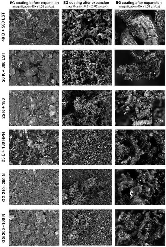 Microscopy images of investigated EG coatings after application on a wood surface under 40× magnification (left column) and after expansion under 6.3× and 40× magnification (middle and right column).