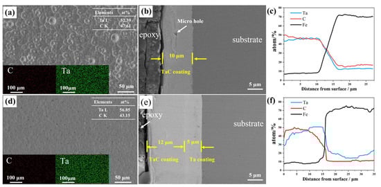 SEM micrographs of the surfaces and cross-sections of the Ta/TaC coatings: (a) surface and EDS mappings of TaC; (b) cross-section and (c) EDS linescan of TaC; (d) surface and EDS mappings of Ta/TaC; (e) cross-section and (f) EDS linescan of Ta/TaC.
