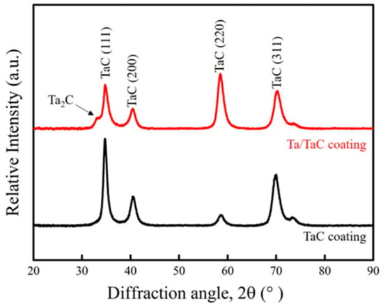- The prepared TaC and Ta/TaC coatings had thicknesses of approximately 10 μm and 17 μm, respectively. Both coatings exhibited dense internal structures with no microdefects at the interface with the substrate. The composite two-layer coating was almost seamless, forming a single entity with better surface smoothness. The XRD results indicate that the surface of the TaC coating was a pure TaC phase, while the composite coating showed a slight formation of the Ta2C phase due to the outward diffusion of Ta elements.