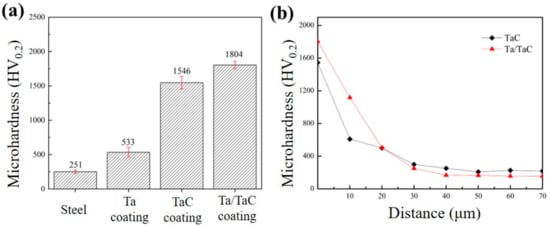 Figure 3 presents the microhardness of the steel matrix, Ta coating, TaC, and Ta/TaC coatings. The average surface microhardness values of the four samples were 251.46 ± 25.68 HV0.2, 533.88 ± 71.64 HV0.2, 1546.38 ± 90.86 HV0.2, and 1804.38 ± 55.82 HV0.2, respectively. The introduction of the Ta transition layer not only significantly enhanced the surface microhardness of the composite coating but also resulted in a more uniform hardness distribution, reflecting the improved uniformity of the coating consistent with the surface morphology’s structure. The cross-sectional hardness variation with depth (Figure 3b) showed a gradient distribution, with a hardness affected depth of about 20 μm. The hardness of the Ta/TaC coating was consistently higher than that of the TaC coating up to a depth of 20 μm. This is mainly due to the increase in thickness of the composite Ta/TaC coating, whereby the Ta layer (more than twice the hardness of the substrate) contributes to the higher hardness of the Ta/TaC-coated sample compared to the TaC-coated sample, thereby enhancing the hardness in the first 20 μm. This gradual change in structure avoids abrupt variations in physical properties between the coating and the substrate, significantly reducing stress concentration damage to the coating and minimizing the potential for coating delamination during wear.