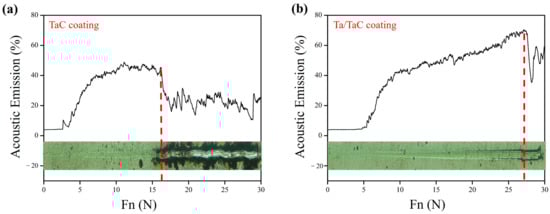 Acoustic emission (AE) signals and optical images of scratches: (a) TaC coating; (b) Ta/TaC coating.