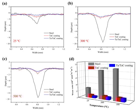 Figure 6 shows the wear profile curves of the substrate and coatings at different temperatures, clearly indicating that the substrate exhibited significantly higher wear loss compared to the two coatings, especially at high temperatures. At 300 °C and 500 °C, the wear depth of the substrate approached 10 μm, and the profile depth of the Ta/TaC coating was slightly better than that of the TaC coating but did not exceed 2 μm. The main reason for the minimal difference in wear profiles between the two coatings is likely that the applied test load did not cause any damage to the TaC coatings, remaining within the load-bearing capacity of the coatings.