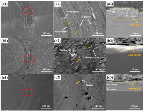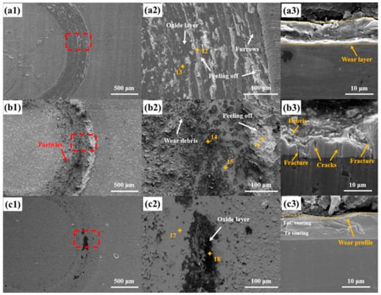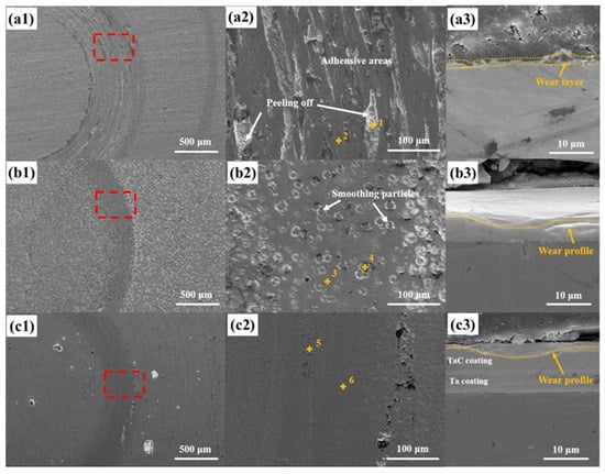 SEM micrographs of the wear surfaces and cross-sections of the samples at 500 °C: (a) substrate; (b) TaC coating; (c) Ta/TaC coating. (a2,b2,c2) and (a3,b3,c3) are high-resolution and cross-sectional SEM images of the corresponding regions (marked in red rectangle) in (a1,b1,c1).