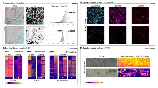 | Spectral-based | HSI: spectral unmixing | VNIR /SWIR | 3D datacube | Spectral reflectance similarity (compa-red to unsoiled areas, or soiling) | HSI camera | Spectral calibration; algorithm pre- and post-processing |