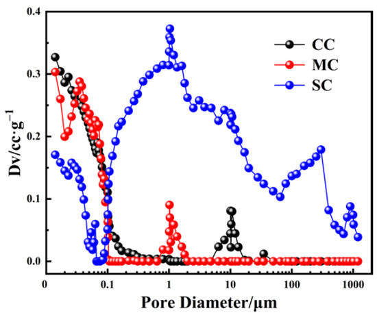 - The water storage performance of prewetted SCs is relatively poor; non-pre-wetted or 50% prewetted CCs absorb a certain amount of water during the mixing process, resulting in a reduction in the local water–cement ratio of the slurry; and 100% prewetted CCs have good water storage performance during the mixing phase.