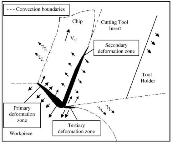 In the turning process, heat generation is highly linked to the deformation and shearing of the work material upon contact with the tool. The tool performs the cutting action by overcoming the shear strength of the material, which generates large amounts of friction and heat resulting in a highly localized thermomechanical-coupled deformation in the shear zone []. There are three main deformation zones where heat is generated and dissipated [,,]. Figure 1 shows those regions, namely, primary, secondary, and tertiary deformation zones.
