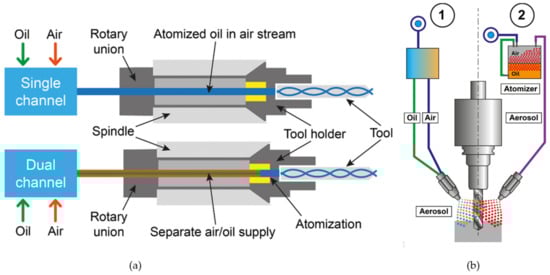 Schematic representation of MQL systems. (a) Internal application using single channel and dual channel and (b) external application using (1) ejector nozzle and (2) conventional nozzle [].