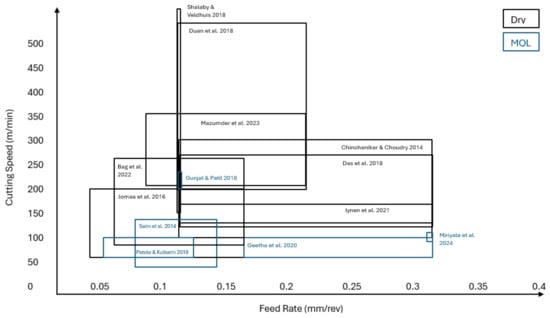 Based on Figure 3, it is shown that researchers mostly focus on cutting parameters in the range of 50–350 m/min and 0.05–0.3 mm/rev for the cutting speed and feed rate, respectively. A very high cutting speed of up to more than 500 m/min is observable; however, it includes using highly advanced tool materials such as alumina ceramic and PCBN, which are known to be costly [,]. In particular for MQL, researchers are restricted to the lower region of cutting speed only, with a maximum speed of up to 250 m/min, as conducted by []. This is due to the penetrability effect of the MQL droplet. According to [], at high cutting speeds, the MQL protective layer loses its effectiveness in lubricating the tool–chip interface. Additionally, the chip’s plastic deformation at high cutting speeds hinders the oil mist from reaching the cutting zones. When lubrication becomes less efficient at elevated cutting speeds, the temperature at the tool edge increases.