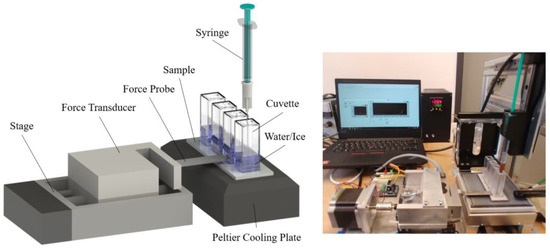 The ice adhesion shear stress at the interface was measured using the cuvette-encased ice column method, a process similar to the setup described by Meuler et al. (Figure 2) [50]. In this setup, disposable cuvettes (polystyrene) were placed open-side down on the laser-structured surface, which was then cooled for 15 min to a temperature of −30 °C by a Peltier cooling element (TC160Pro, DataPhysics, Filderstadt, Germany). The temperature was measured between the cooling element and the sample. After 15 min, 1 mL of distilled water was injected through a hole in the cuvette using a syringe and an automated dispenser at a rate of 170 µL/s. After a freezing time of 15 min, the ice column was sheared off by a stepper motor (103H7123, Sanyo Denki, Moriguchi, Japan) driven force probe (3 mm above the sample surface) connected to a force transducer (Typ S2 500N with an AE301 interface, Hottinger Baldwin Messtechnik HBM, Darmstadt, Germany). The analog voltage signal was recorded using an interface (NI USB-6009, Texas Instruments, Dallas, TX, USA) and LabView 2023 software. The ice adhesion shear stress was calculated by dividing the measured force by the interface area of 10 mm × 10 mm, although it is essential to note that there is a mixed shear/tensile mode due to the height of the push-force application point [51]. Since all measurements were performed under the same conditions, the effect of the push height was not covered in this work. For laser-structured stainless steel, a few cycles of ice adhesion measurements do not affect the structure’s micro-geometry or surface roughness [33].