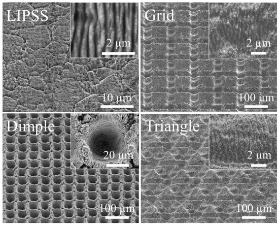 SEM images: laser structures taken at a 45° tilt angle (close-ups have been taken without tilt). LIPSS nanostructure with a spatial period of 560 µm. Grid, dimple, and triangle microstructures feature superimposed LIPSS nanostructures.