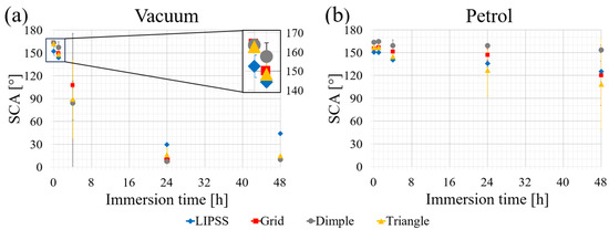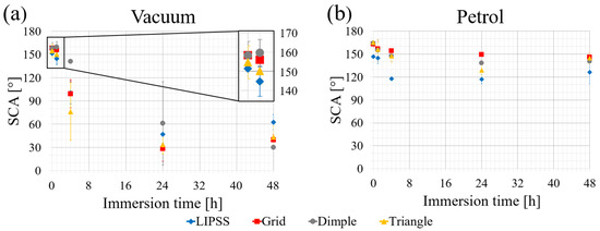 Plot of the static contact angle (SCA) over the immersion time in acetone for (a) vacuum-treated samples and (b) petrol-treated samples with different structure types.