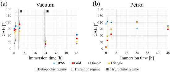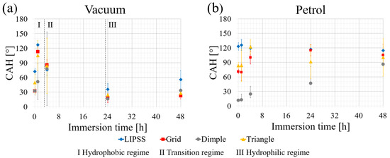 The grid, dimples, and triangle structures of the vacuum-treated samples exhibited a low average initial CAH of 38° (Figure 6). Interestingly, the CAH of LIPSS, which showed the lowest initial ice adhesion of all the structures tested, resulted in an average of 72°. Additionally, for the petrol-treated samples, the dimple structure, which previously exhibited the strongest ice adhesion shear stresses, showed clearly the lowest average CAH of 11°. Both of these findings support Momen et al.’s assumption that the CAH does not linearly correlate with ice adhesion [44]. A further CAH evaluation revealed a strong, substantial increase in the CAHs after 1 h for the vacuum-treated samples and only slight changes for the petrol-treated samples (Figure 6). Subsequently, after 4 h, a sharp CAH decrease in the vacuum-treated samples occurred due to the transition from the hydrophobic to the hydrophilic wettability regime. In contrast, the petrol-treated samples displayed a different behavior. Here, on average, only a slight deviation of the CAH occurred after 1 h; however, after 4 h, the CAHs increased clearly for the grid, dimple, and triangle structures. Overall, the petrol-treated surfaces remained hydrophobic throughout the experiment.